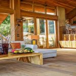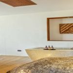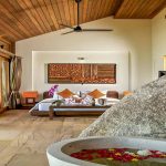 The villas settle between these boulders, offering a refined sense of spaces that contrast with the rough textures of the natural surroundings. The dominant architecture feature of each villa is its iconic roof structures. Clad in cider shingles, the roofs rise and fall across the building, swooping up to provide dramatic lofty spaces over the main living areas then reducing to more intimate scale over the bedrooms.