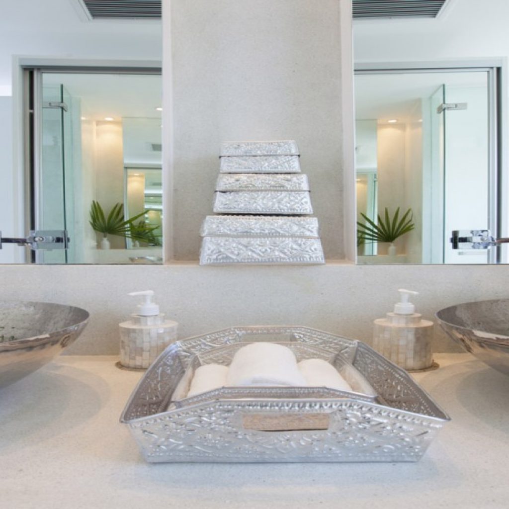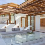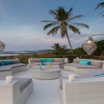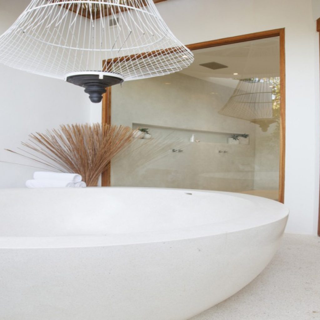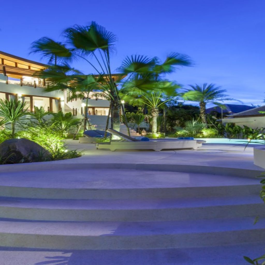 Exceptional amount of poolside space with the curved and tiered salt water infinity pool; small shaded pool kid’s pool cascading into the larger pool; swim-up poolside bar; infinity-edged plunge pool with reclining terrazzo bench; sunken poolside chill-out lounge and sala; upstairs moon terrace.
