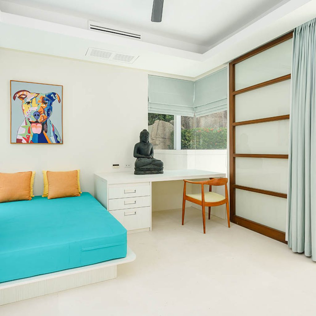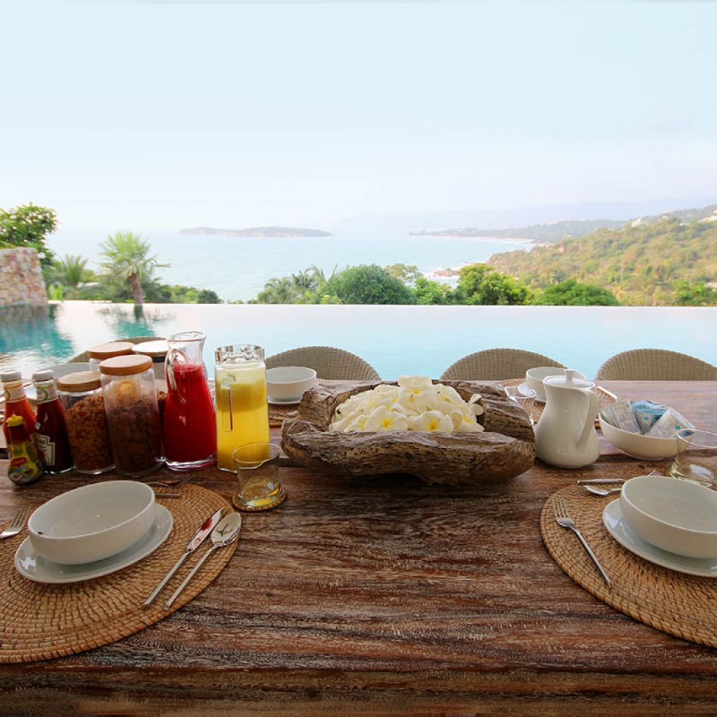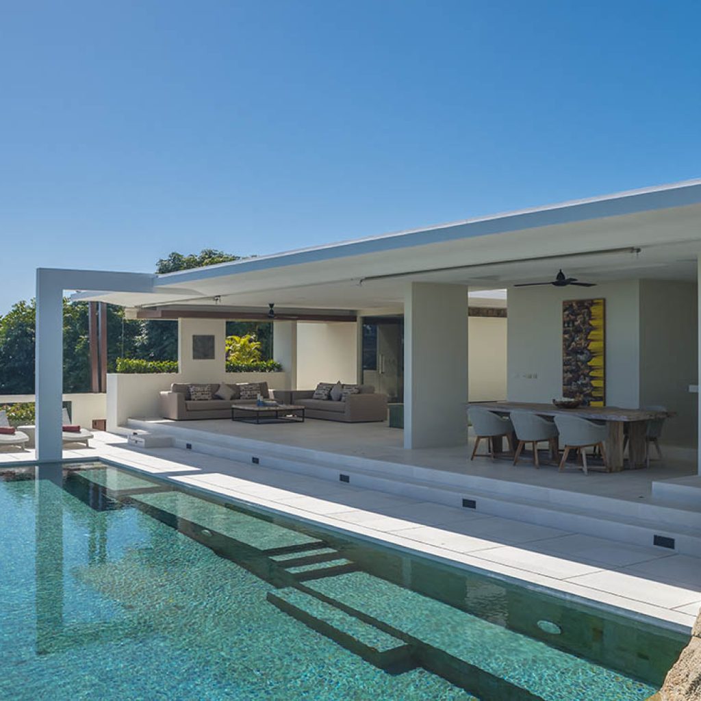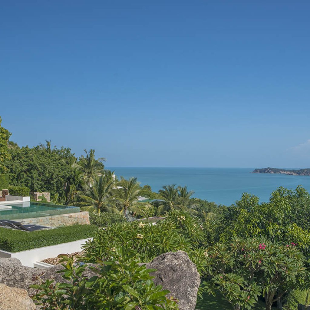 Villa 7 is Samujana’s original villa and as a result it occupies one of the best positions on the estate with a fabulous elevated ocean view. It has now been remodeled and refurbished to the highest standard. The villa has four large en-suite bedrooms that accommodates up to 8 adults and the flexibility of an extra child’s bedroom/playroom or study room with its own powder room/shower room. All bedrooms are equipped with hairdryers & in room safes with 1 extra bed & 1 crib available per villa. It has an outdoor show kitchen with a bar, an adjoining dining area with spectacular views and with the added benefit of a fully equipped and air conditioned internal kitchen. There is a spacious outside living area overlooking 15 meter infinity pool and the ocean. It has an air conditioned cinema/TV/living room adjacent to the outside living area but also a fully equipped air conditioned gym. Beautiful internal and external landscaping and an infinity water feature. Parking for 2 cars with a discrete laundry area, a separate storeroom, full backup generators and uniformed security.