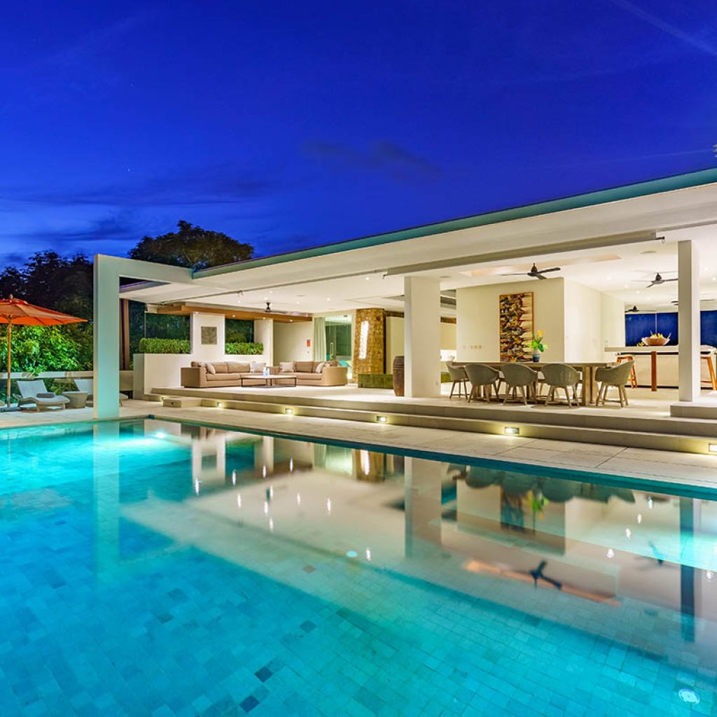 Villa 7 has four extremely spacious en-suite bedrooms and is positioned in an enviable hilltop position. The villa has a large open plan kitchen and BBQ overlooking the stunning infinity edge pool. The pool also features a natural rock outcrop and a secret water bench. There is also a fully equipped AV room with a plasma screen television and a surround sound system.